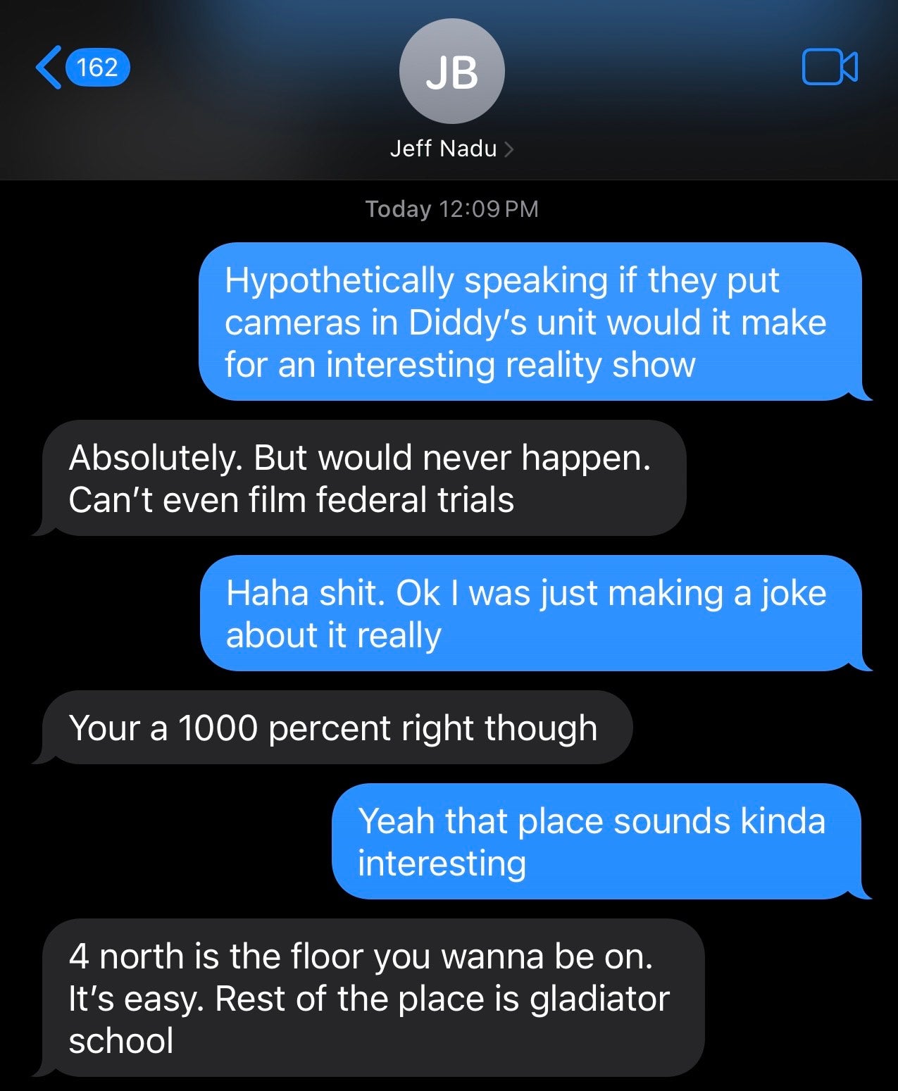 Ok, never mind then. Maybe not that boring after all. But unfortunately the reality show doesn't seem to be in the cards from a legal perspective. However, now that Trump is about to be president, I feel like we might be in from some rule changes. Diddy will still have a few months until his trial when he's inaugurated. Maybe there's some wiggle room there in the name of content. And maybe we delve into the rest of that gladiator school parts of the prison while we're at it. Can't help but think there might be some good/horrific stuff going on there as well.