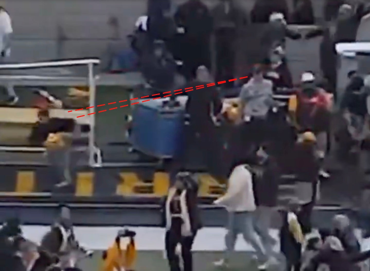 His heist was poorly planned all along. Sprinting away was never the move. If he was ever going to get away with that helmet, it was going to have to be a covert operation. He basically did the equivalent of smashing through the front window of a jewelry store in broad daylight, directly in front a cop, and attempting to get away on foot. Except instead of an out of shape cop, it's an equipment manager with 4.6 speed and immaculate tackling form. But the kid managed to get his hands on the helmet without drawing attention. At this point of the video, nobody seemed to notice him.