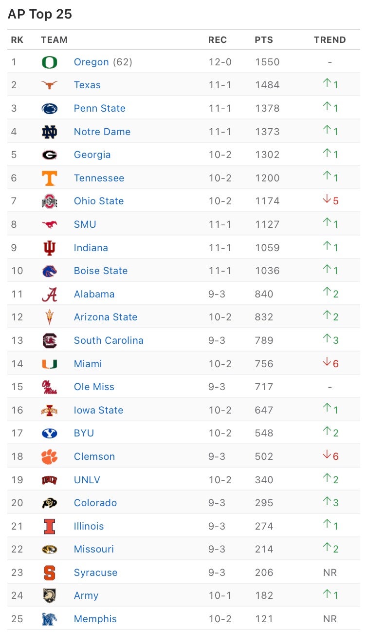 I'm sure that's largely due to the 12-team playoff. Instead of having maybe 6 fan bases personally attacking each other's families over 4 playoff spots, there's now… well… there were a whole lot more than that coming down the stretch. Way more fan bases who feel like their teams should matter in the big picture. Way more disrespect to go around. But now that we're heading into conference championship week, the playoff picture is finally shaping up. There's still plenty to be determined seeding-wise. But based on my "knowledge" of how the committee thinks, it looks as if there's only 1 at large bid up for grabs. I think pretty much everyone agrees on that. The official playoff rankings won't be out until Tuesday, but here's the AP poll that came out today.