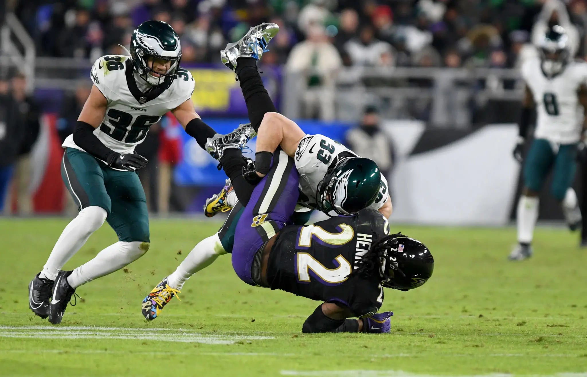 Look at how high off of the turf his cleats are. Nobody is supposed to be able to hit Derrick Henry that violently, but here comes Cooper DeJean out of nowhere stapling one of the most unstoppable dudes in the NFL to the turf.