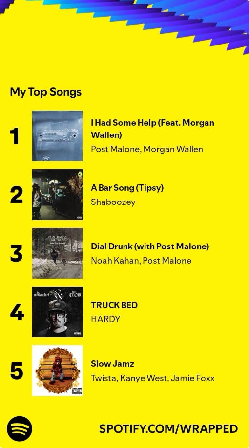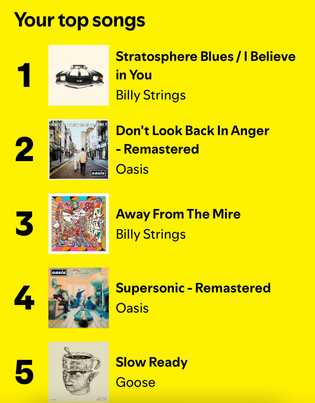 If you follow any girl on Spotify you've seen the above list of the same 5 artists in every iteration. Not for nothing, a huge year for the girls. Give it up for women!!!! Taylor, Chappell, Sabrina, Ariana, and Gracie ran the damn ball up the middle for 7 yards a carry all year. And Olivia too, gotta give my girl Olivia credit as well. What's shocking about the above though is the number 1 song is a Chappell song…..from Kelly Keegs!!!!! Upset of the century, folks! But that truly is how good Red Wine Supernova is, you can hit "repeat" on that 15 times in a row before moving on.