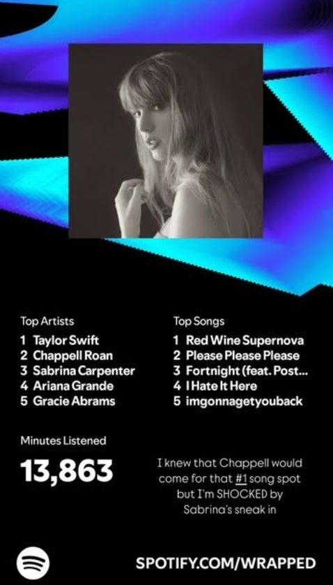 There's the girls again, but this time with Charli xcx instead of Chappel on Gia's Wrapped. I gotta be honest- I did not like Charli xcx's album at all. The "Brat" branding, A+. They knocked that shit out of the park. The album itself I could not get into. I kept checking to make sure I was listening to the right thing, like "THIS is the album people are going bananas over???". I guess it just isn't for me.