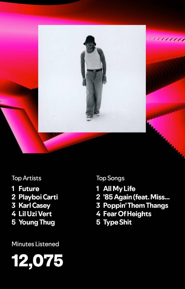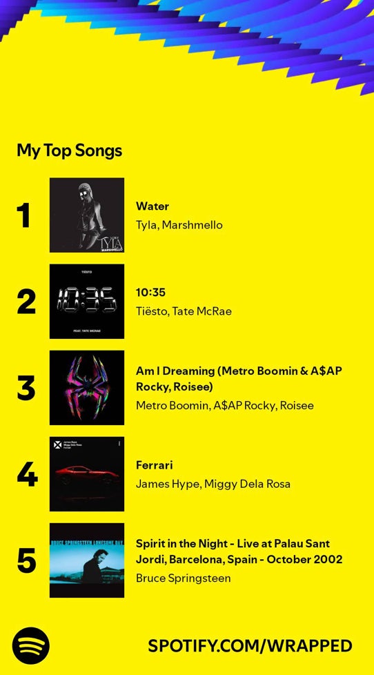 The king of the Jersey Shore himself, Jeff D Lowe. I imagine when JDL is at the shore all Summer that Tyla/Tiesto/Metro Boomin playlist is on repeat from 8am to 2am all day every day. His number 1 artist was still Bruce, but I've heard "Miggy Dela Rosa" was a close 2nd.