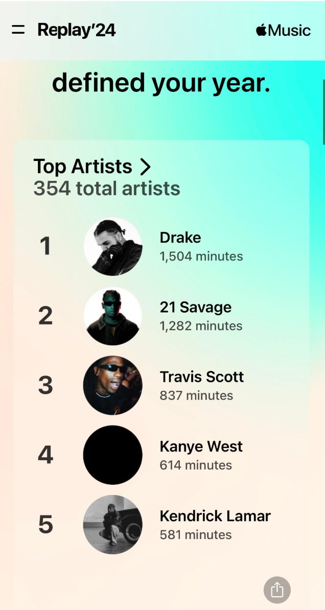 Out first Apple Music submission! From everything I hear, Apple Music is superior to Spotify in terms of music quality. Apparently they get the music fresh off the vine, meanwhile Spotify has some additives that waters it down a little. I'll never leave Spotify because I'm too used to it, but I hear the folks over at Apple Music are doing a spot up job. As for the top 5 above, can anyone take a guess? I'll give some hints- Young, works in the Chicago office, and I'm super intimidated by. It's Annika, aka King Krabby Patty. 1,500 minutes of Drake I'm assuming is the same as me having Dashboard Confessional in my top 5.