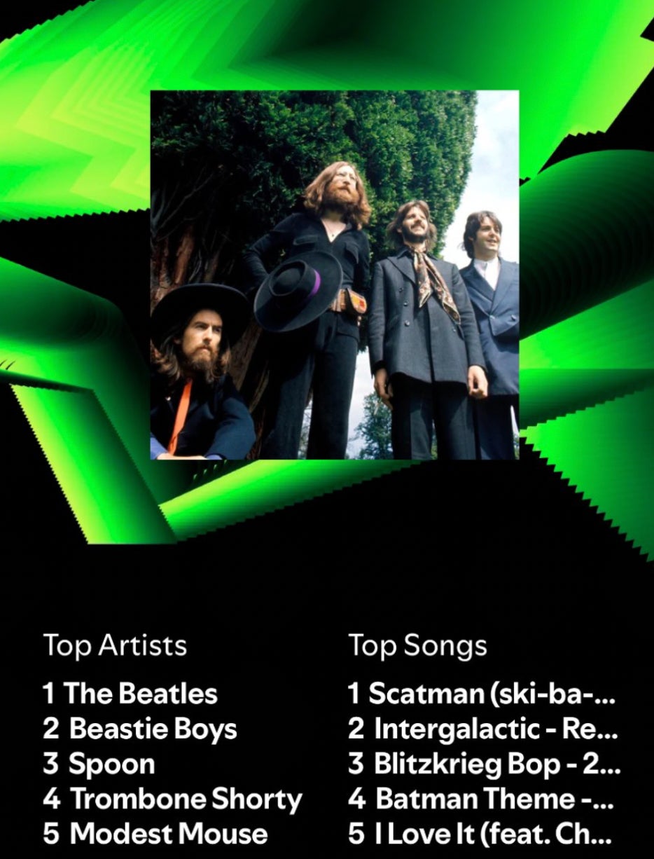 Just an incredible spectrum of songs and artists on here. I saw a lot of my friends with babies share similar Wrapped- turns out when you're driving around with toddlers every day and find one song that they will listen to, you end up playing that one song for 6 straight months until your head explodes. That's how you get both Modest Moust and the Batman Theme on your same Wrapped.