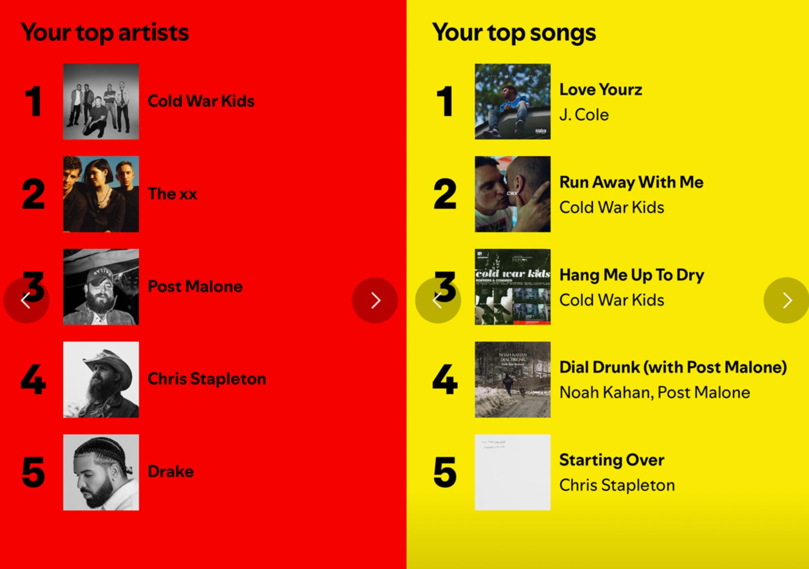 This is from the one and only Dante the Don. I gotta be honest, I did not foresee Cold War Kids at the top of his list. The aren't emo or sad or yelling about conspiracy theories enough for me to have picked them as the Don's favorite band. J. Cole at the top of the song chart makes much more sense. And once again, shout out to Noah Kahan.