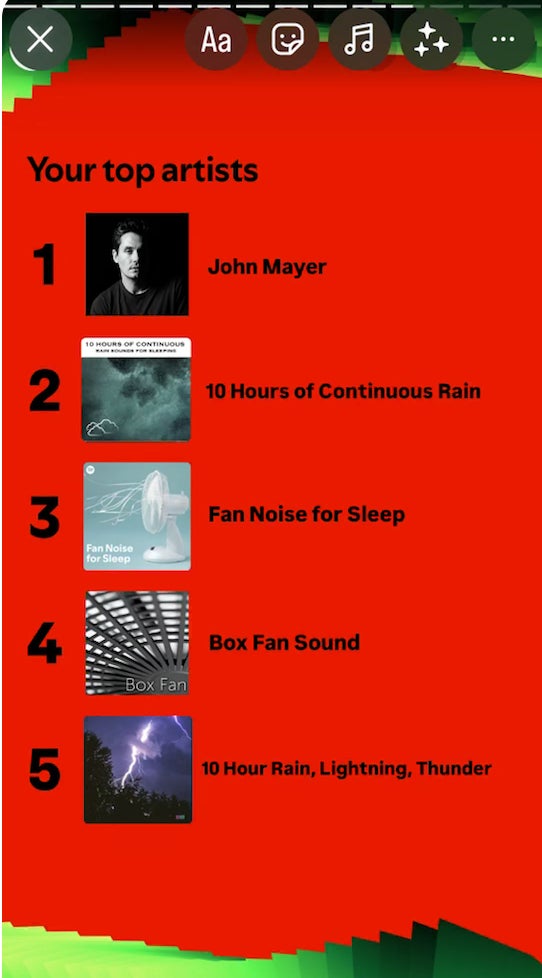 And finally, what I was waiting for…someone with white noise as their most played. I'm surprised more people don't have this. I can't sleep without white noise, but I use a fan, which I assume most others do too? But if I didn't like the fan noise, my top 5 would for sure be all white noise like this: