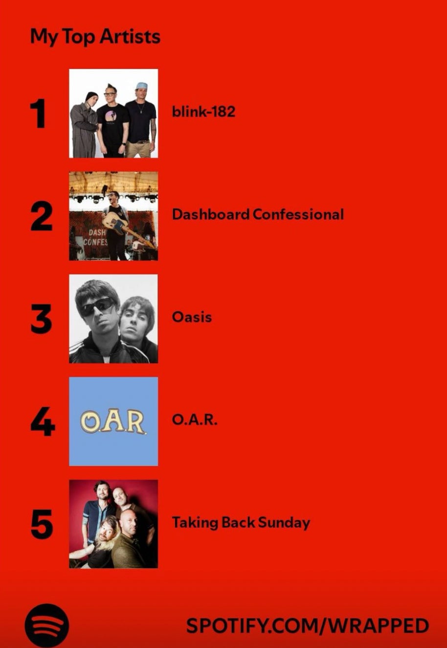 Here's something fun- I never listened to really any Dashboard outside the huge hits until this year. I found their MTV Unplugged and got obsessed with it for a few months, which put them at #2 and 4/5 songs on my top 5 are all from the MTV Unplugged album. (The other song is Seventy times 7). But for my top 5 artists, it's sorta perfect. Blink, Oasis, and OAR are my 3 favorite bands, and TBS is the perfect gym music for me.