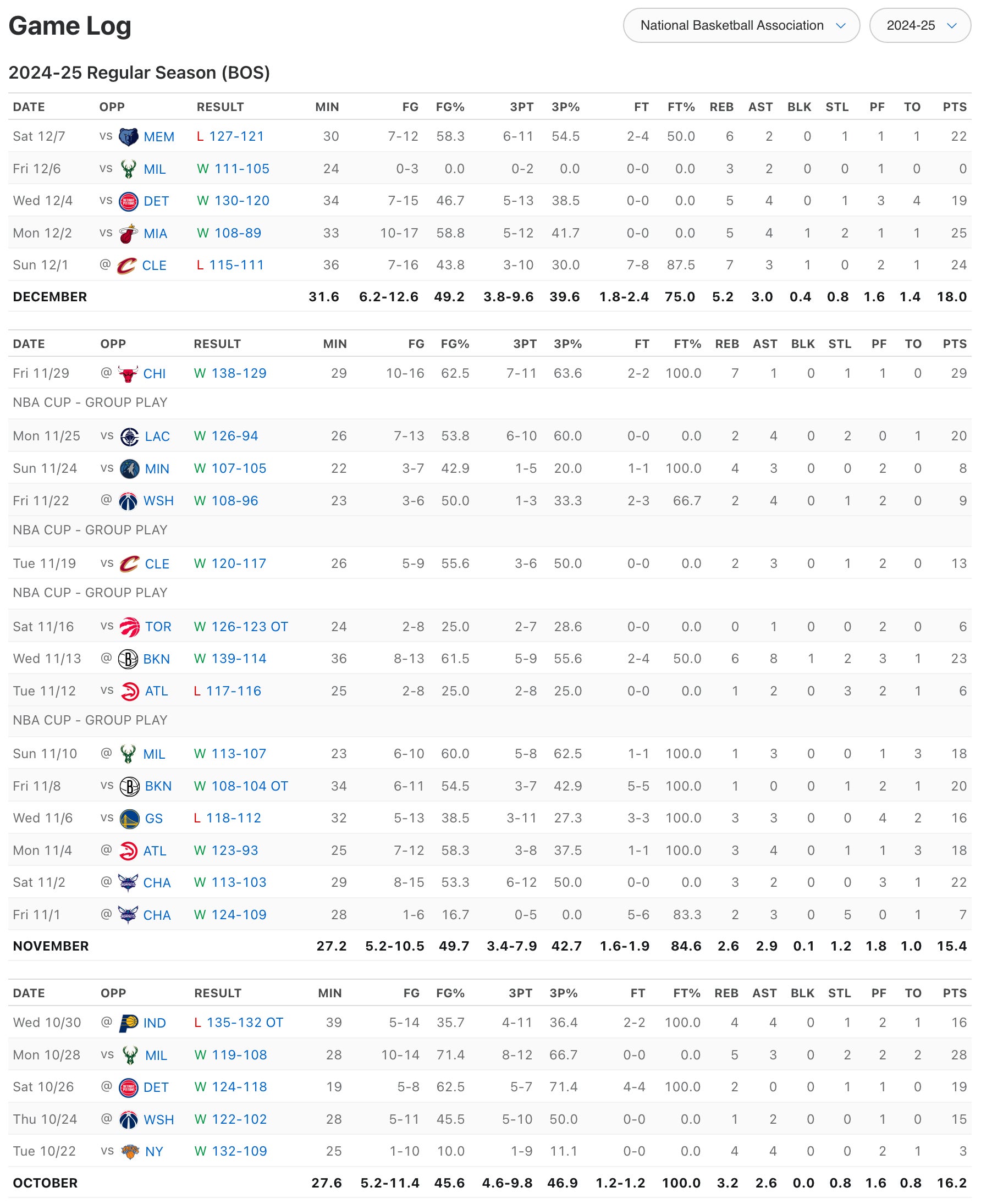 When I think of true Payton Pritchard "stinkers", I'd go with Opening Night, 11/1 vs CHA, 11/12 vs ATL, 11/16 vs TOR, and 12/6 vs MIL. Go ahead and look at that graphic above and look at what happened immediately following one of those disasterclasses. Every single time there was an immediate response with Pritchard getting back to the level he's been at all year, so it wasn't surprising at all that we had more of the same last night. This is what Payton Pritchard does. It's why you can rely on him in this role because if nothing else, he's consistent.