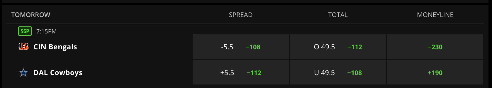 Tonight on Monday Night Football, we've got the 4-8 Cincinnati Bengals at the 5-7 Dallas Cowboys +5.5 (49.5)