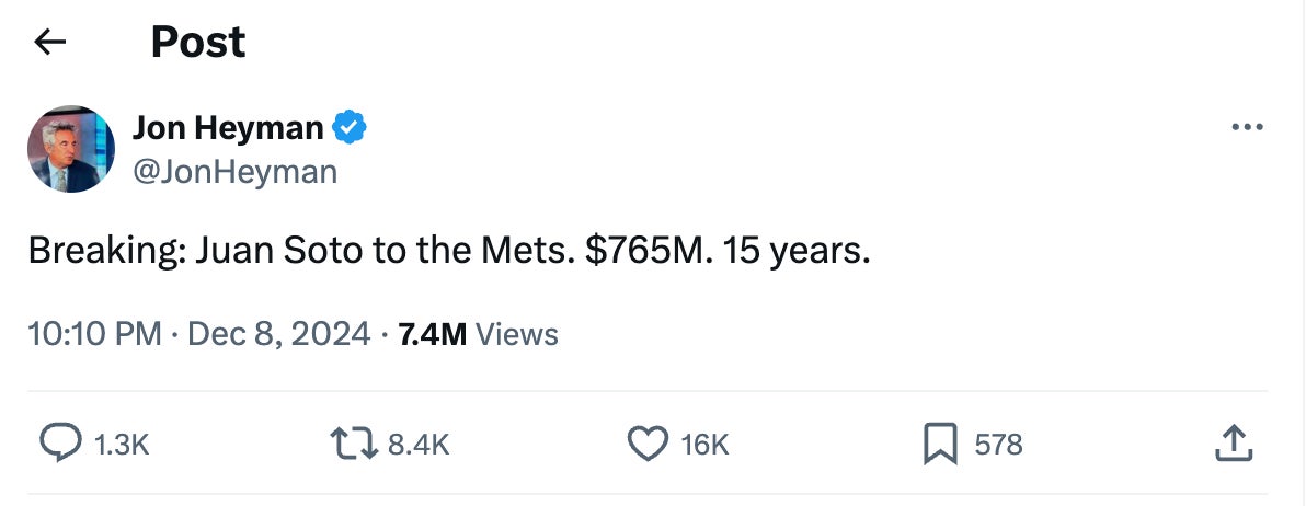 Juan Soto is a New York Met. He'll spend the next 15 years in Queens. Theres so much to talk about in terms of how it impacts this team in 2025. Does he bat second, in between Lindor and VIentos? Do the Mets go re-sign Pete and put Soto more in the middle of the lineup around Alonso? What Mets and MLB records does he break? Will he take the Mets to the Promised Land and how many times does he do it? What will the statue look like in Queens? These are all the questions that we will answer as we head into the future.