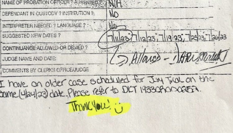 “She put a smiley face on the continuance request. This is of significance because Judge Darnbrough was the only judge who allowed or denied the continuance requests. So she knew he would see the smiley face on the continuance request.”