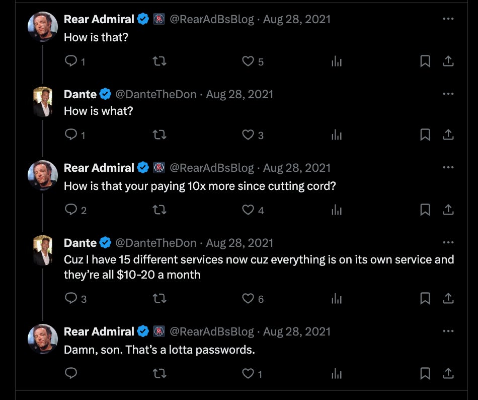 He took it to text to tell me there's no way I could be paying that much and that streaming was the greatest thing that has happened since technicolor television.