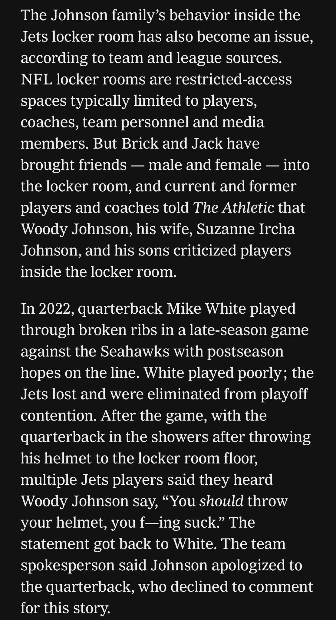 That last sentence is especially remarkable, because the Jets themselves are confirming this actually happened. So it wasn't some disgruntled player making stuff up. It wasn't someone mishearing the boss in a crowded room. This is what the trial lawyers call "a fair and accurate" description of what Johnson said.
