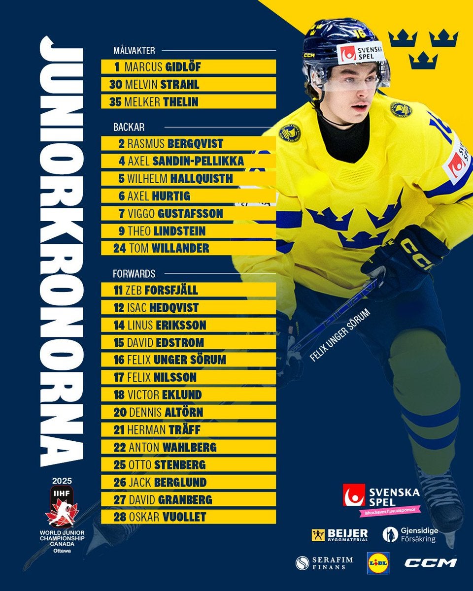 He had a strong tournament last year putting up 9 points in 7 games. 3 of his 5 goals came in a hat trick against Germany, but he also scored in the gold medal game against USA. He also had a massive U18 tournament in 2023 where he was named one of the best forwards of the tournament. He was 4th in scoring that tournament behind the cheat code line of Will Smith, Gabe Perreault, and Ryan Leonard. So Otto Stenberg is a guy who Sweden really needs to get going this tournament, because you're probably not holding USA and Canada to just 2 or 3 goals.