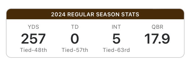 Frank, my good friend, let me let you in on a little secret being kept up in northeast Ohio right now.....we know DTR stinks. Now, if you want to call the Browns dumb for drafting him, I'm all ears. But if anyone wants to call them dumb for starting him over Jameis today against the Dolphins, I got a bridge to sell you. Because the fact of the matter is that, unlike the Giants, word has spread across the decision makers within the organization that it would behoove the Browns to lose the rest of the way out. And there is no one, and I mean NO ONE, that gives you a better chance to lose a football game than Dorian Thompson-Robinson. Here were his season stats coming into tonight's "big game" that was supposed to be on Sunday Night Football:
