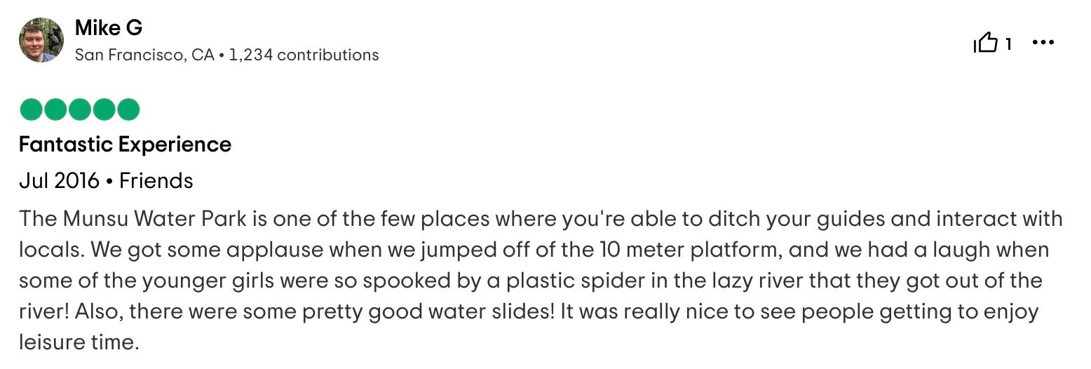 It's not like anyone you know has been there. Idk who the hell these people on TripAdvisor are. I'm supposed to believe Mike G from San Francisco just had a grand old time at The Munsu Water Park? That North Korean locals erupted with cheers as he jumped off the 10 meter platform?