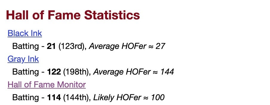 Sure that graph almost definitely can't be viewed clearly on whatever screen you are looking at it on, but 399 home runs is nothing to sneeze at, including FORTY TWO in 1988. Add in seven Top 10 MVP finishes with two Gold Gloves and you have a hell of a career. Add those with a 114 Batting score in the Hall of Fame Monitor and you have a Hall of Famer (I admittedly don't know what that number or the ink numbers mean. But I use them to support my argument when I see fit).