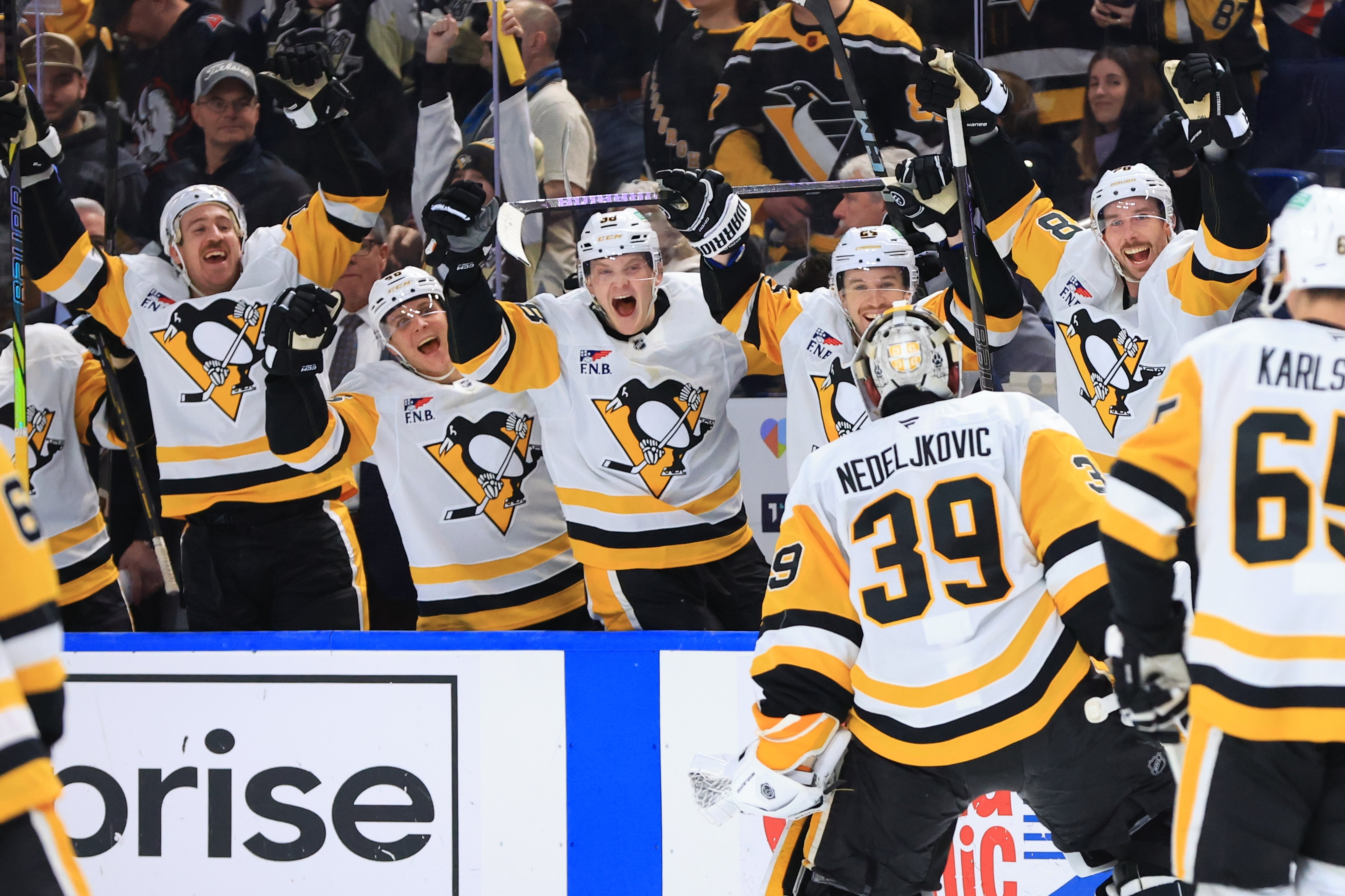 Pittsburgh Penguins goalie Alex Nedeljkovic joined that list last night with this snipe from behind the goal line to put away the Sabres.