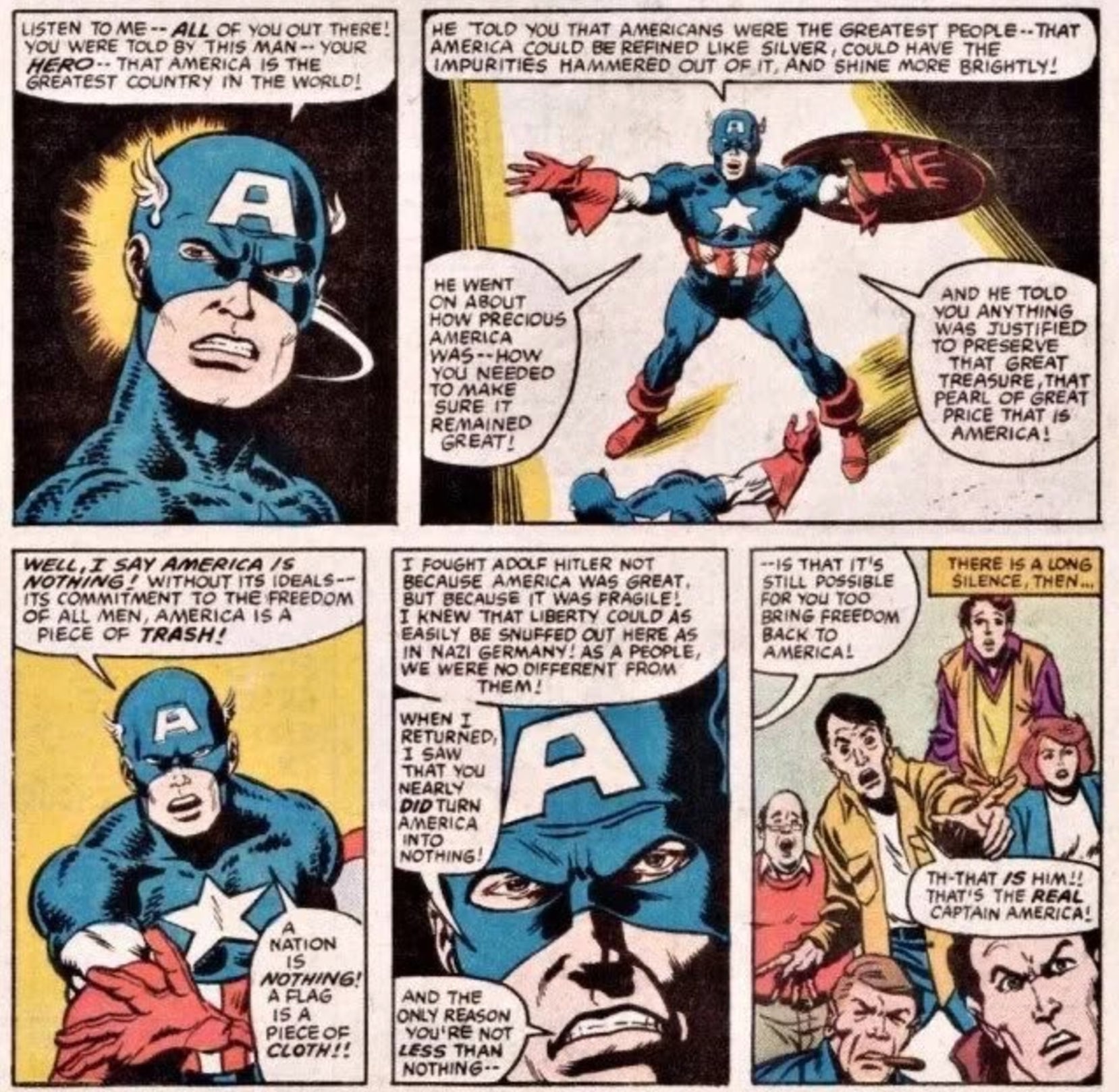 In the MCU, after he's used as the poster child of World War II propaganda in 'The First Avenger', he literally spends the next two movies in his trilogy fighting the American government. When Tony Stark signs the Sokovia Accords and stands with the US government, Captain America is the one to oppose him the strongest. Again - it's not anti-American, and isn't intended as such, but Cap has always been about what America should be rather than what it is, going back to the earlier iterations of the character….