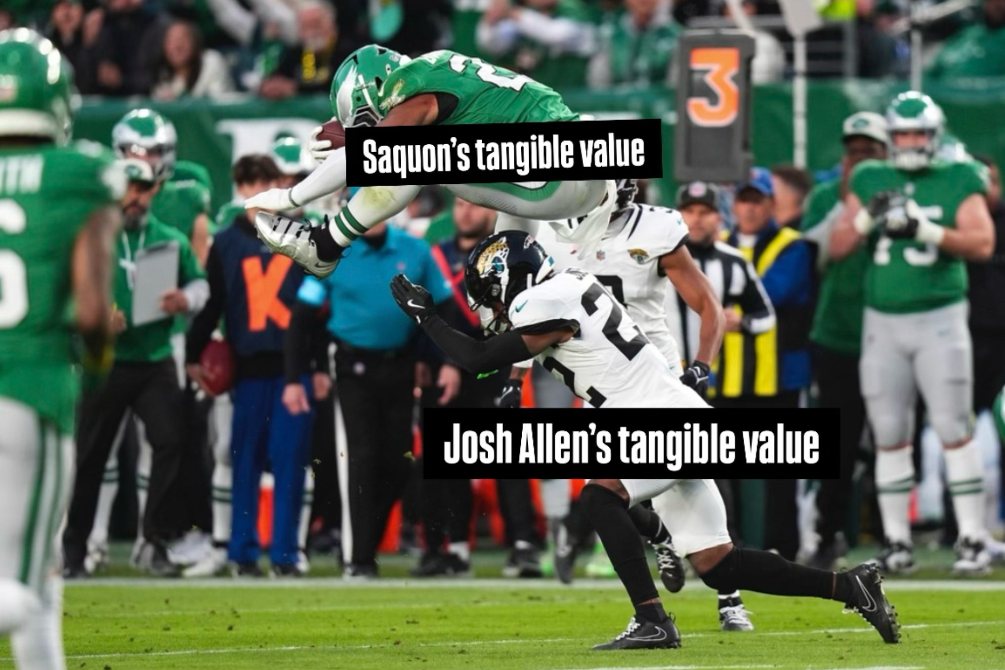 But there's also more basic math here that seemed to be completely ignored when naming Josh Allen the MVP of the the league. What tangible value did Josh Allen bring to the Bills from last year to this year? They went from losing to the Chiefs in the playoffs last year, to losing to the Chiefs in the playoffs this year. Seems like a lateral move, maybe with just a touch of upwards trajectory to me since this year they made it a round further. What tangible value did Saquon Barkley bring to the Eagles from last year to this year? Oh I don't know. The 2023 Eagles suffered one of the most historic collapses in NFL history last year, were the laughing stock of the league at the end of the year, and now they're playing for another Super Bowl thanks to a 2000+ yard season from Saquon.