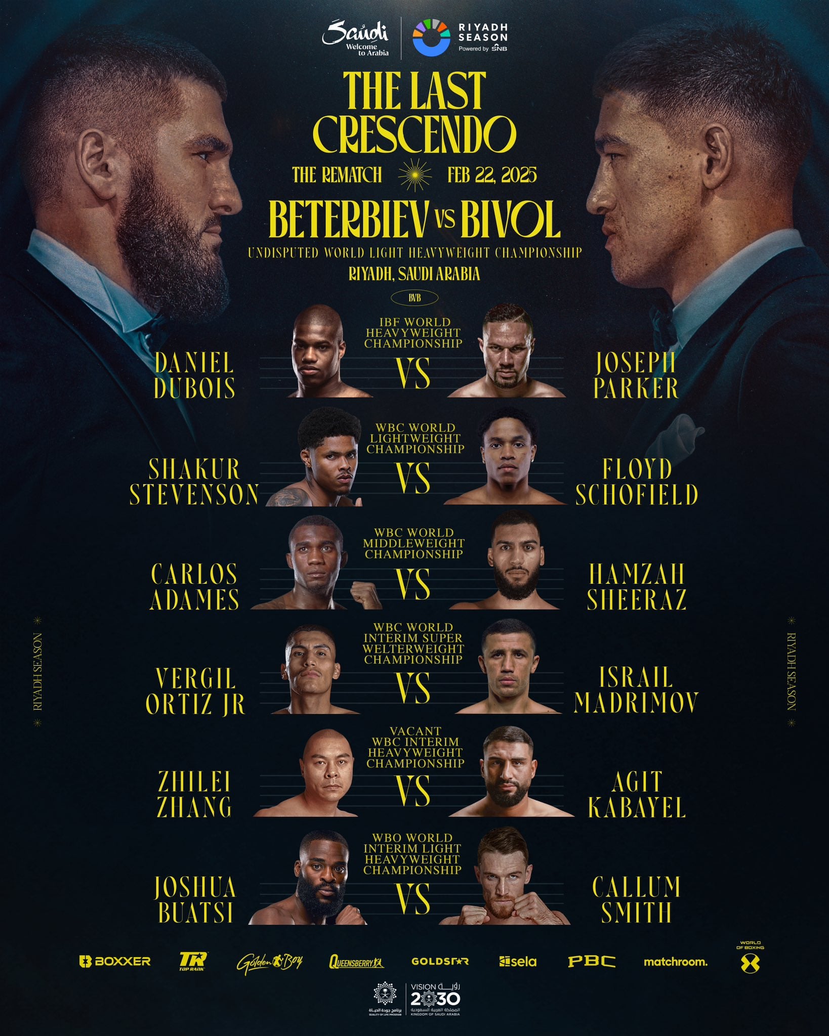 Last thing… As social media (and my last 2 blogs) seem to be obsessed with cards that MAY happen in the next couple of years, let me remind everyone that ONE OF THE GREATEST CARDS OF ALL TIME is going down later this month when undisputed light heavyweight champ Artur Beterbiev gives Bivol his rematch… I'll embed a graphic of the full card and let you know that almost every fight could be a main event under other circumstances.