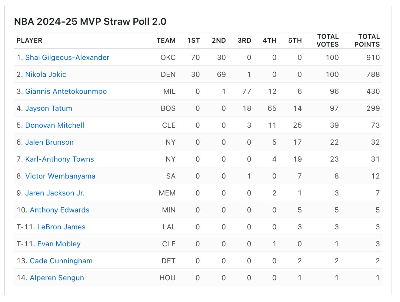 The bigger takeaway of course is that anyone trying to suggest this race is anything other than SGA vs Jokic is simply refusing to accept reality. You can argue all you want about 3-5, but that's all semantics to me. What matters in this poll is the race at the top, and given that gap between SGA/Jokic I think it sheds light on how inconsistent this award tends to be from season to season.