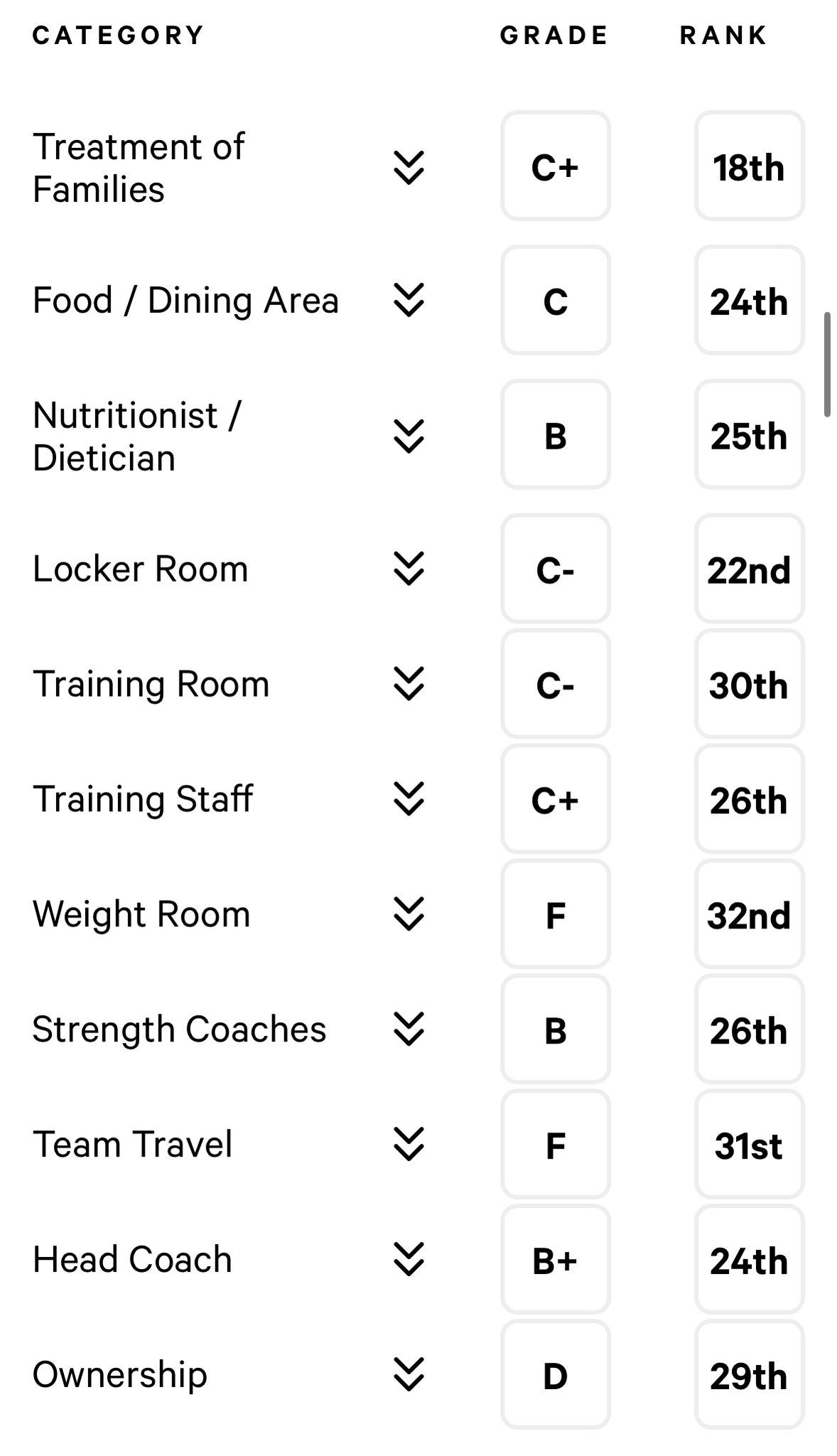 After receiving an F- last year for their treatment of players’ families, the team made immediate improvements, including hiring a staff member to manage family services and adding a family room and daycare during games. These changes were well received, and players believe that family support is now the team’s biggest strength.