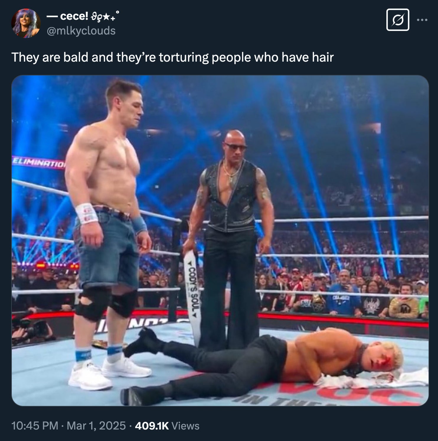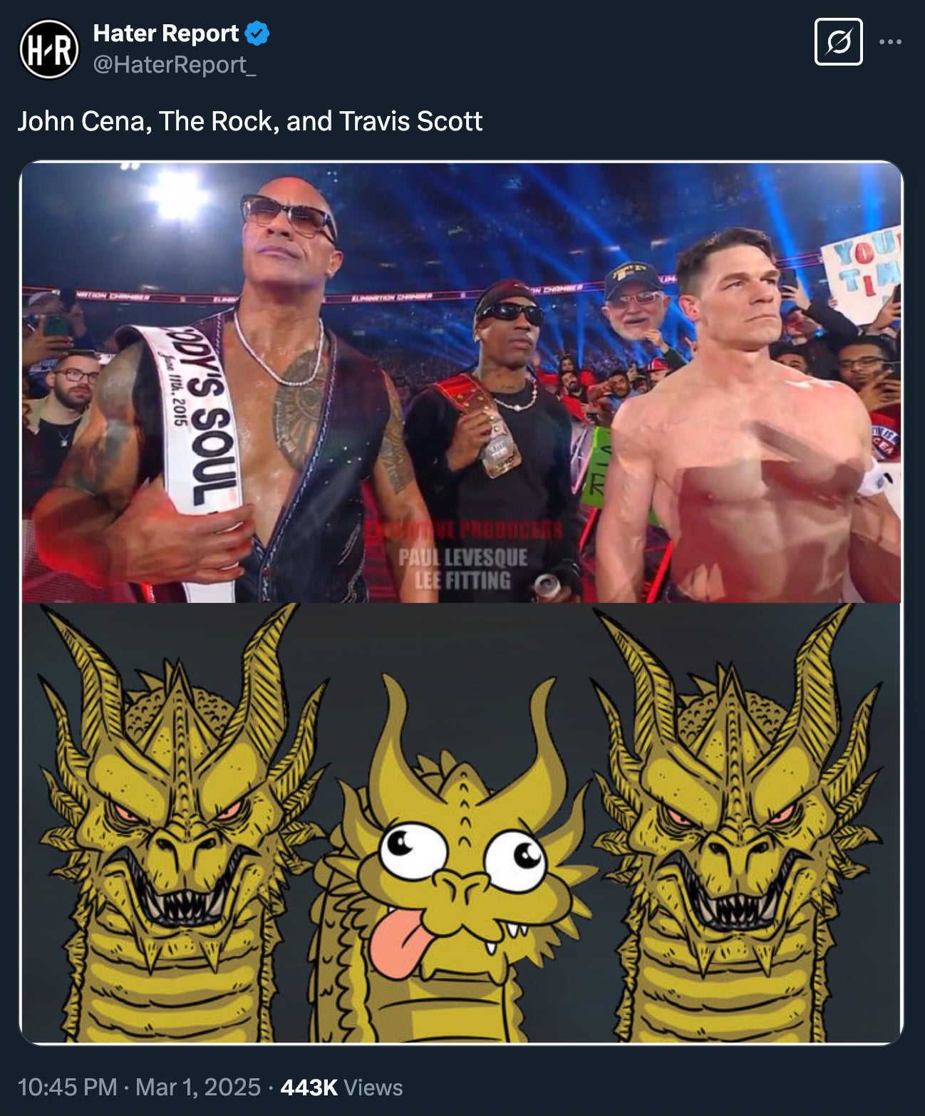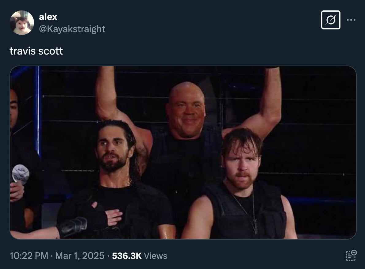I know it hasn't even been 24 hours yet, but I feel comfortable calling that one of the greatest, most shocking twists in the history of professional wrestling. Hulk Hogan joining the nWo and Steve Austin aligning himself with Vince McMahon are the only turns I think could even be comparable, but I wasn't watching either one live so it's hard for me to truly say. The Undertaker's Streak ending is the only thing I've personally seen inside the squared circle that was more surprising than this - and I've watched a lot of wrestling in my life, so that says a lot. Oh, and Travis Scott was also there for some reason. And he smacked the everliving SHIT outta Cody Rhodes....