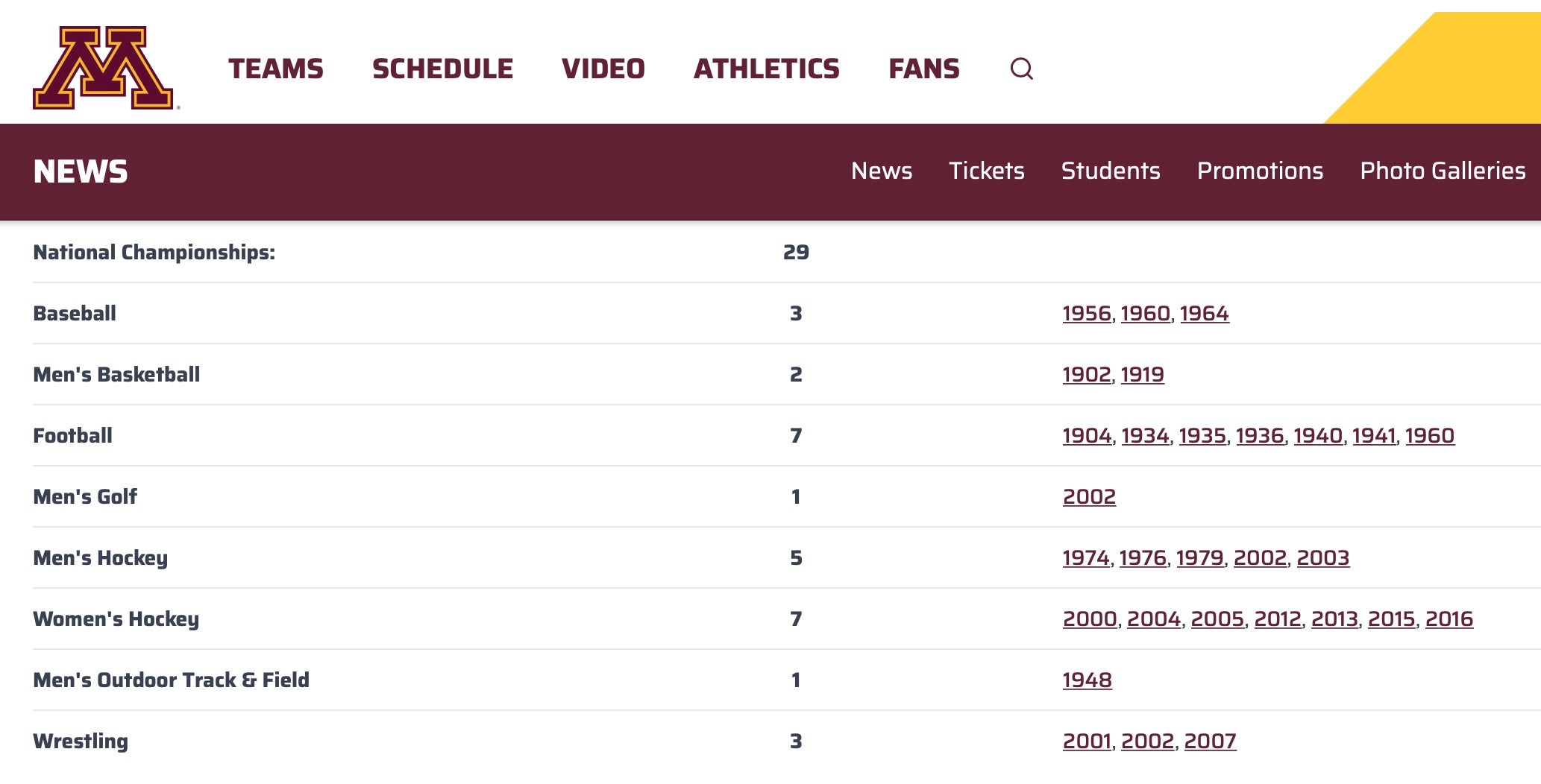 But again… bad day for Minnesota. People forget that Minneapolis, Minnesota is low-key low-key, low-key the most cursed sports city in the country. It's been 123 seasons since one of their 4 professional sports franchises won a championship. And the Minnesota Golden Gophers haven't been much better. Thank god for women's hockey. If it weren't for them, this graphic might look embarrassing.