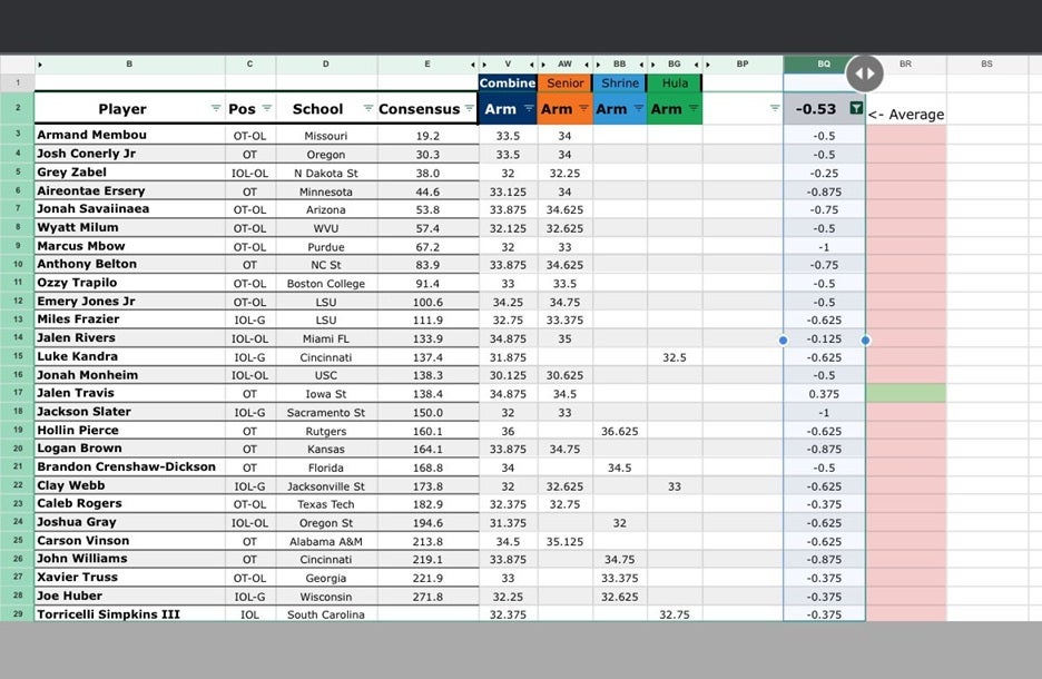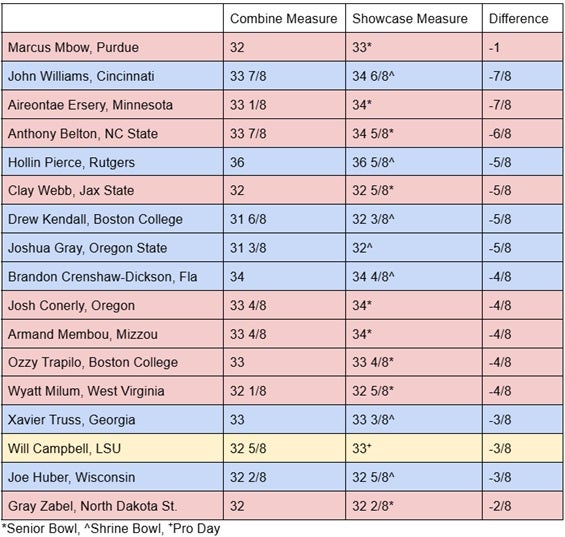 That’s not to say that the Combine and showcase games always match up – they don’t. But it’s usually a difference of an eighth of an inch or two in either direction. Looking at top linemen (tackles, guards, and centers) from both games this year, the differences are bigger and are off in the same direction. This is something observers started making note of well before Campbell’s second measurement in Baton Rouge on Wednesday.