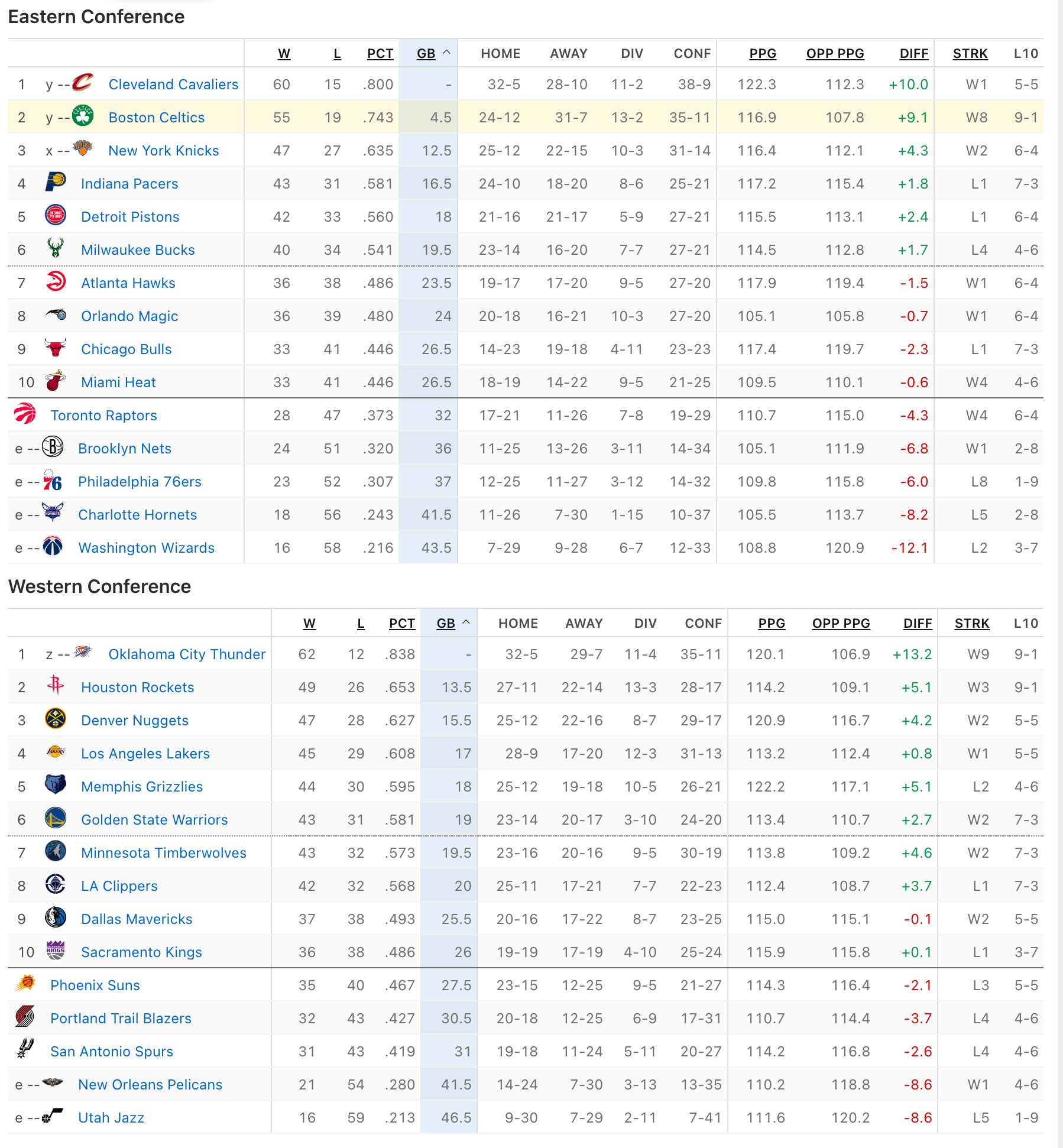 In the West, good fucking luck trying to predict how seeds 2-10 shake out. No matter what combination of matchups we end up with, I can't think of a bad matchup. You're telling me you wouldn't love a GS/LAL first round series if the Warriors are able to climb into 5? How about a potential DEN/MIN opening round? OKC's reward for one of the best seasons we've ever seen could be a healthy Playoff Kawhi Leonard?