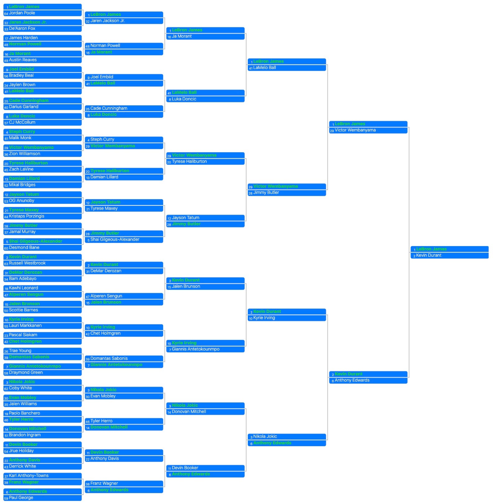 And because I wrote this whole ass blog about a hypothetical 64-man 1-on-1 tournament. I suppose I should take the time to put together a hypothetical bracket. Based loosely off NBA2K ratings, leading scorers, name recognition for casual fans, and what I think would be the most fun outcomes.