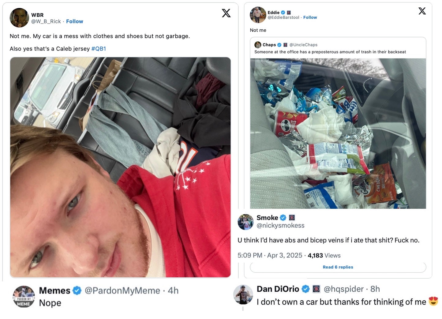 I'm just kidding that's not a real person. That's just a random kid's profile picture from Twitter. It'd be wild if I went down that road though. Some people would probably say I should. They'd probably say a person with such a backseat deserves to be fucked by the internet. "If you take a job at Barstool, no matter where it is, you may end up in content. It's what you signed up for." But I won't do it. Because I, much like Chaps, have a heart. And am kind of being a pussy about diving too deep into this because I feel bad. So to my mystery co-worker out there who spent all last night trying to come up with a way to change the outward appearance of their vehicle. Godspeed brother (or sister). Having a trash can backseat doesn't make you a bad person. I know how things can get away from you. But fix it now. And never let your car get that way again. Please.