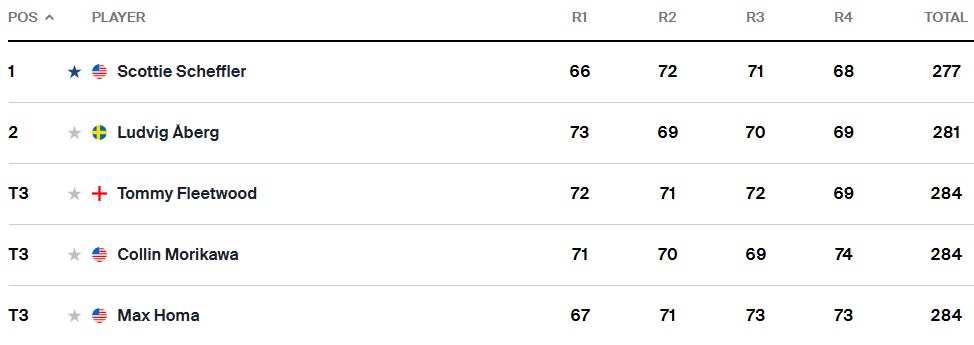 Scottie never looked back. Morikawa followed up his double at 9 with a rinsed shot on 11 to fall out of it. Aberg also made double on 11. Homa sailed his tee shot on 12 by just a smidge but got a rock hard bounce into the bushes behind the green, also leading to double. And Scottie did what Scottie does. Rock solid consistent golf featuring birdies on 10, 13, 14, and 16 and a minor blip on the tough 11th for bogey to coast to a Second Nine 33 and a stress-free 4 shot victory.