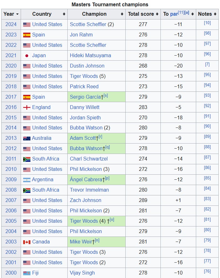 Last year's leaderboard and recent winners of The Masters Tournament.