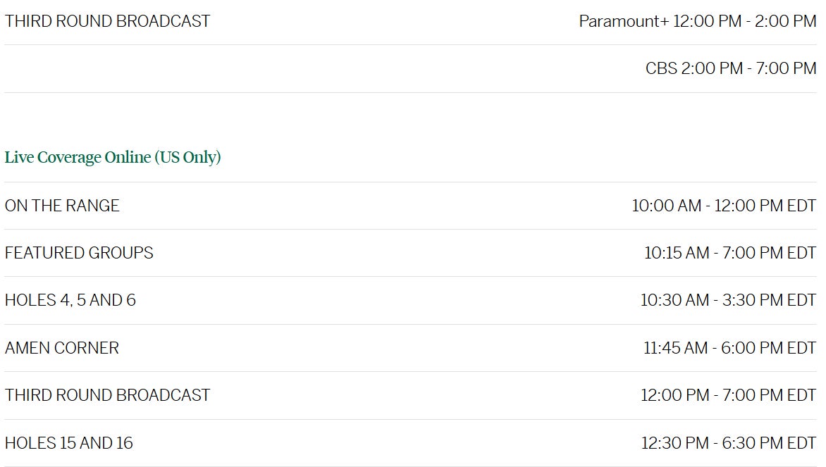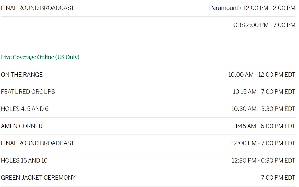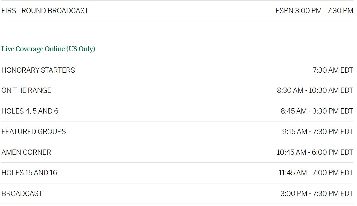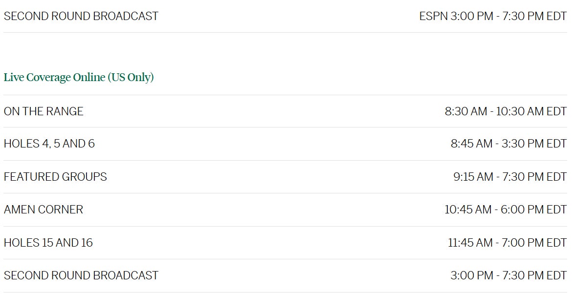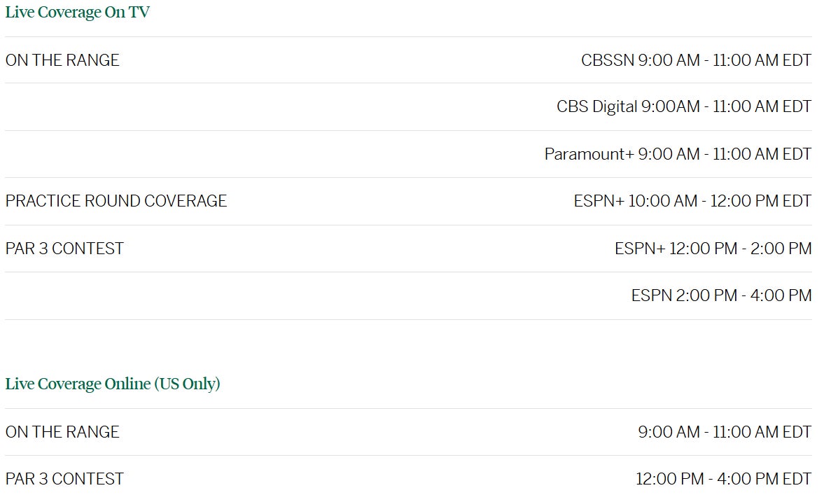Courtesy of the Masters website, below is your schedule for wall to wall coverage the Masters Tournament. Basically, anything listed below as Live Coverage Online (other than "On The Range") is also available on ESPN+.