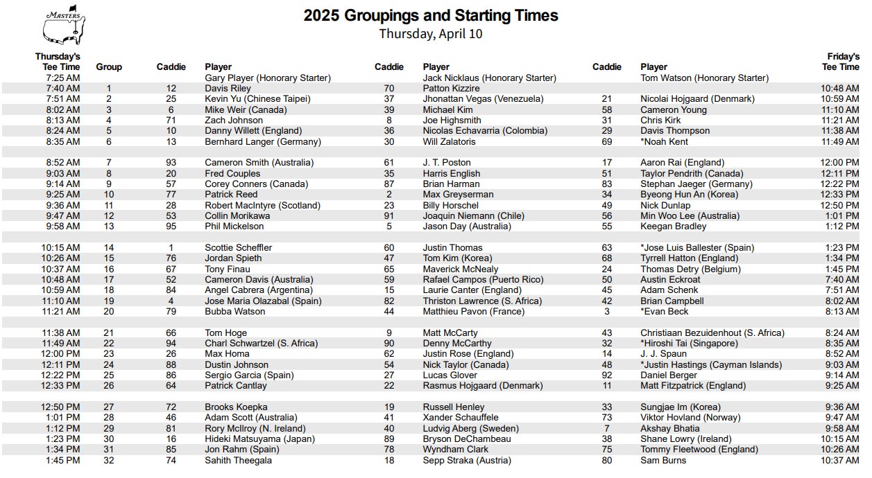 95 golfers at this year's edition with a 36 hole cut for the Top 50 and ties. For a long time this Tournament had a rule where anyone outside the Top 50 that were within 10 strokes of the leader would also make the cut. They ditched it for the COVID-delayed Fall Masters a couple years ago (presumably due to daylight issues) and haven't brought it back since. Kinda a shame, sometimes it was fun to see how far out in front a leader could get on Friday and effectively boot guys out of the Tournament. Regardless, barring inclement weather, everybody goes off of 1 at Augusta National. No split tees.