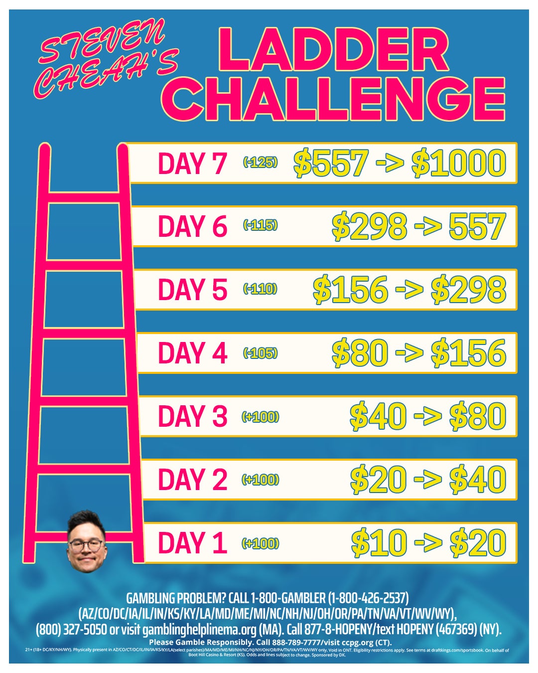 I wanted to do a Ladder Challenge, but $10 to $10,000 over 10-days felt like a lot. I lowered it a little bit, so we're going to do 7-days to turn into $1,000. We are also going to do descending odds. So the first three days will be even money and the subsequent four days will be -105, -110, -115, and ending with a -125 play.