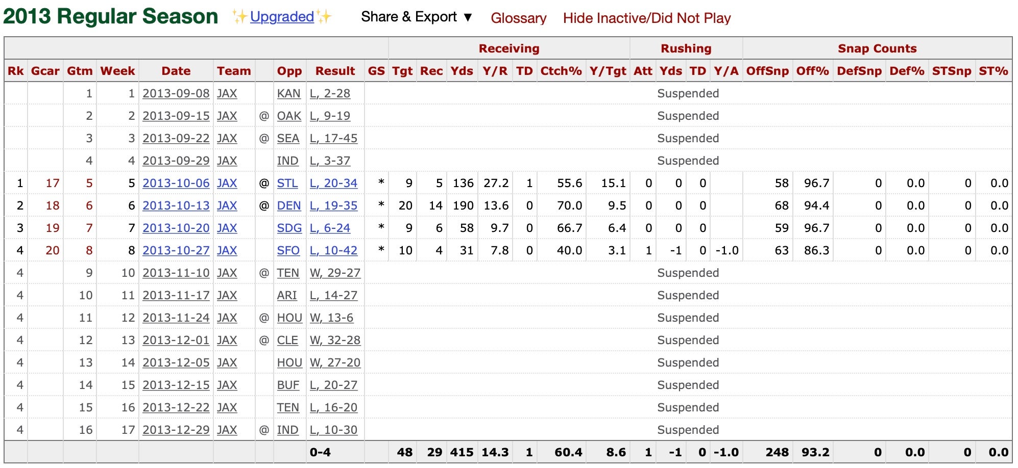 Then in his second season, before he was suspended without pay for yet another violation of the NFL's substance abuse policy, just look at the numbers he was putting up.