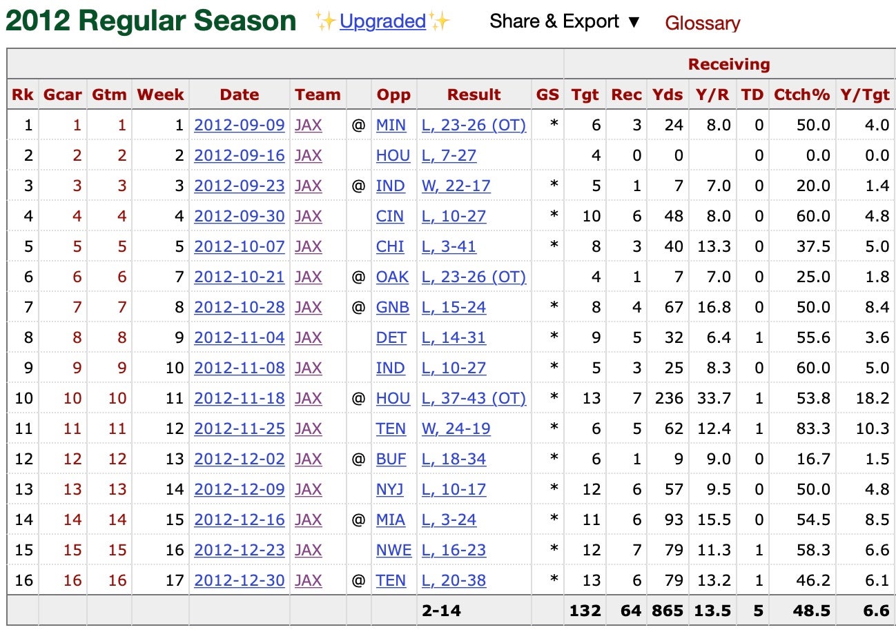 The crazy thing is, despite all his troubles, despite how quickly he flamed out, despite being drunk a majority of the time, he was still a highly effective NFL wide receiver. Halfway through his first year he was a bonafide #1 receiver. Especially considering he had Blaine Gabbart and Chad Henne throwing him the ball on a 2-14 Jaguars team, it was an impressive rookie season.