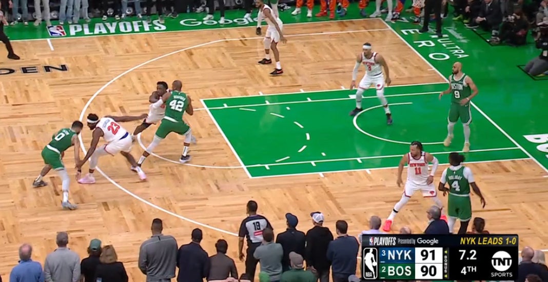 Why did that matter? Because on the final possession, when you are trying to get a stop with 18 seconds left, you had 0 fouls to give. There's a strong chance that if you take out those intentional fouls, the Celts go into that final stand with a foul to give. If that's the case, you can give it well before Brunson makes his move, reset, force them into another play, and maybe something happens. Instead, the Jrue foul put Brunson on the line because they were in the bonus (plus it was a shooting foul), and that was the game. Like right here, if you have a foul to give in this spot, you give it and it prevents Brunson from getting the leverage on the spin, which had Jrue out of position and forced to foul.