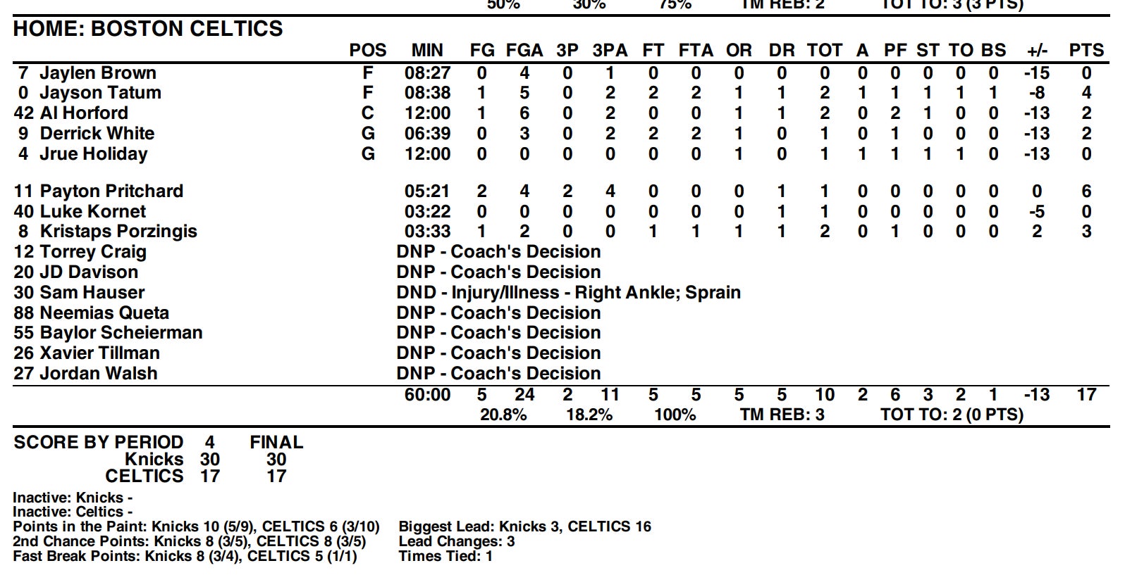 0-3. Is anyone surprised they lost? You shouldn't be. The Knicks had just 4 OREB all game, and managed 6 in the 4th by doing the same thing we saw in Game 1. Josh Hart crashing. KAT grabbing boards over Horford. Those are the margins that are how you find yourself in this position. For the second straight game, the Celts were awful at the details and for the second straight game they got burned.