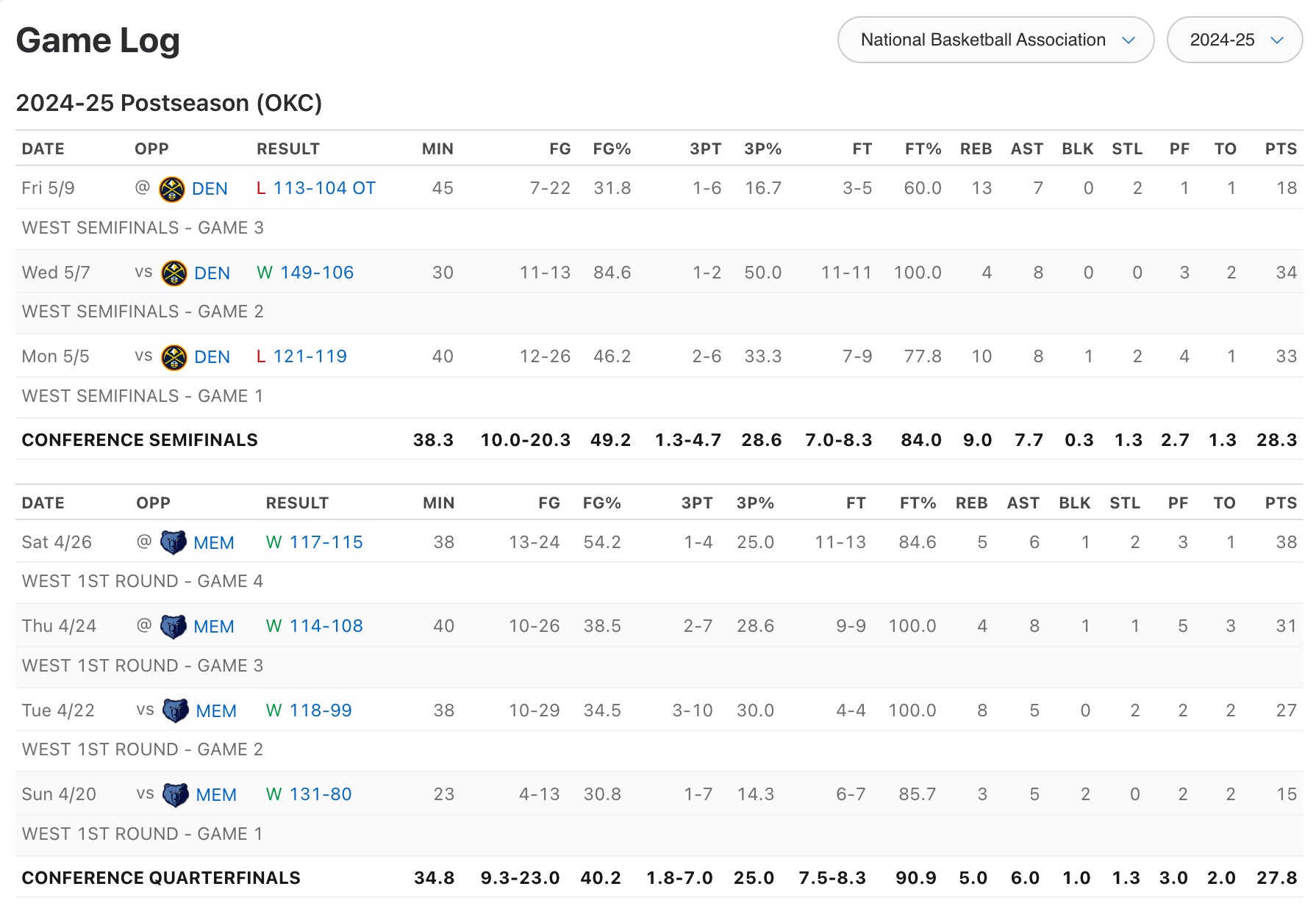 For OKC, it's impossible to look past what SGA did in this game. In fact, he's been pretty awful in 5 of their 7 playoff games