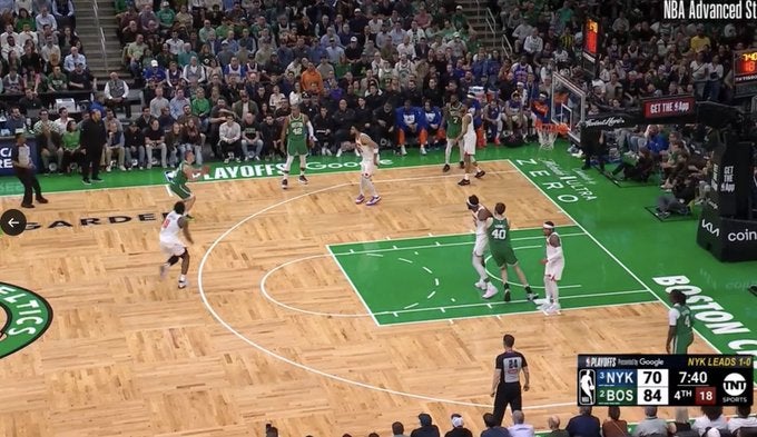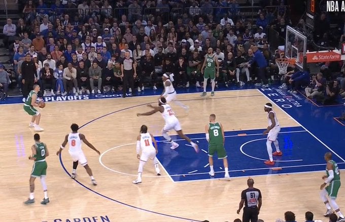 - I loved pretty much every single thing Jrue Holiday did in this game. He only had 8/4/3 on 3-4 (2-3), but in my eyes it was the perfect Jrue Holiday performance. Great awareness to find DWhite as a weakside shooter on multiple occasions, I love the wrinkle from Joe to putting Jrue back as the screener and allowing him to short roll in the middle of the paint as a way to run a 2 man game with either Jaylen/Tatum as the ball handler. Who doesn't love a little inverted Pick and Roll? Especially when the Knicks only have 1 big on the floor and Al is making him guard at the 3pt line?