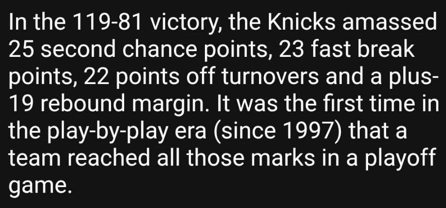 Is it embarrassing for the Celts to have things play out this way? Of course. They were the overwhelming favorite and all that stuff. But at the end of the day, it comes down to what happens on the court, and in this series, they were not the better team. Or at the very least, they did not play like the better team. I know some may not want to give the Knicks credit, but I dunno, I have eyes. As I said above, they earned this series win. This wasn't like 2023 where we had to watch the Heat have the fakest shooting production of all time where Caleb Martin comes out of nowhere and shoots 75% from three. That's not how the Knicks won this game or this series. They won it playing their style and executing their strengths, and they deserve credit for that.