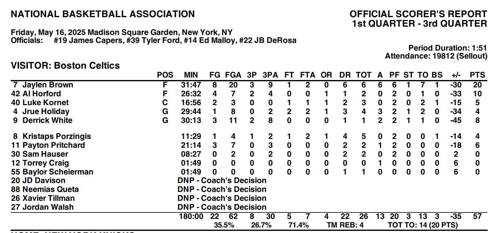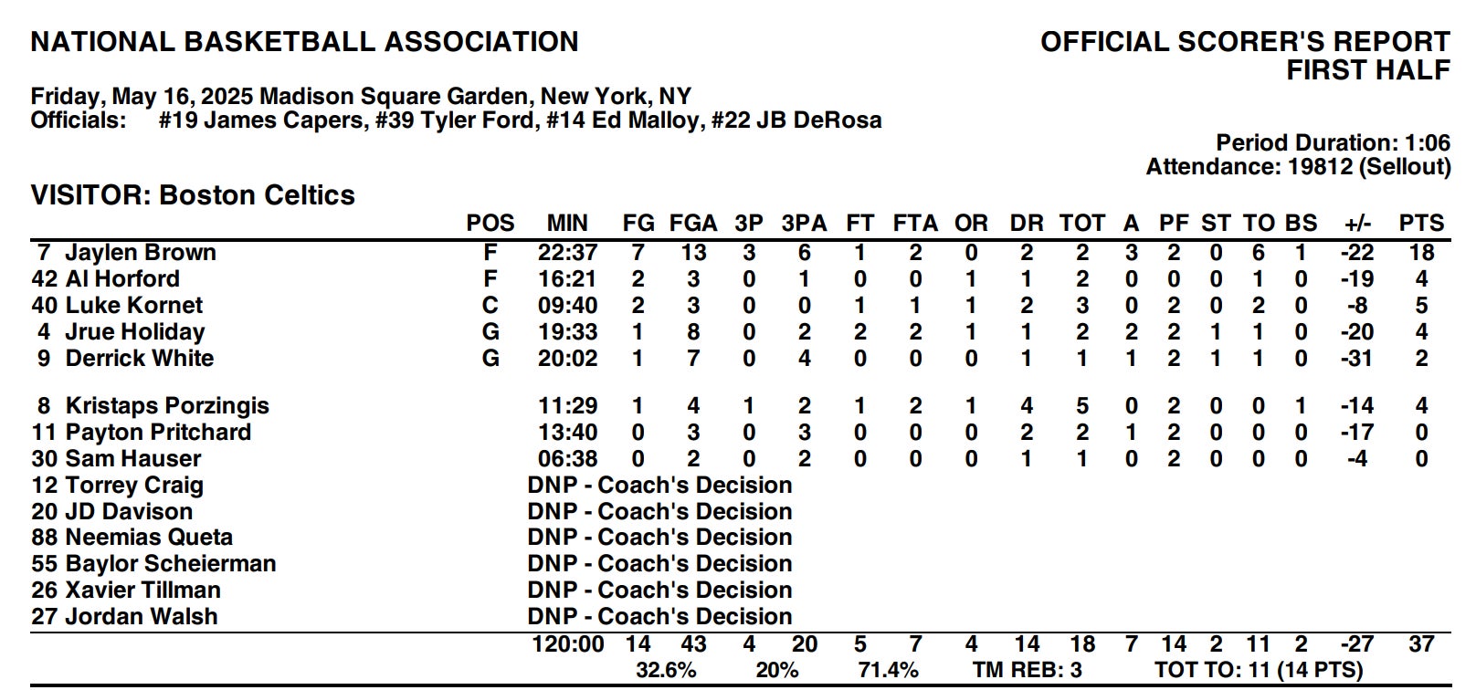 This was when the 3P production fell off a cliff, and sadly, there was not enough efficient 2FG to make up for the difference. All in all, in the first half, the Celts were 10-23 on 2s and 4-20 on 3s. At the end of the day, it's about execution