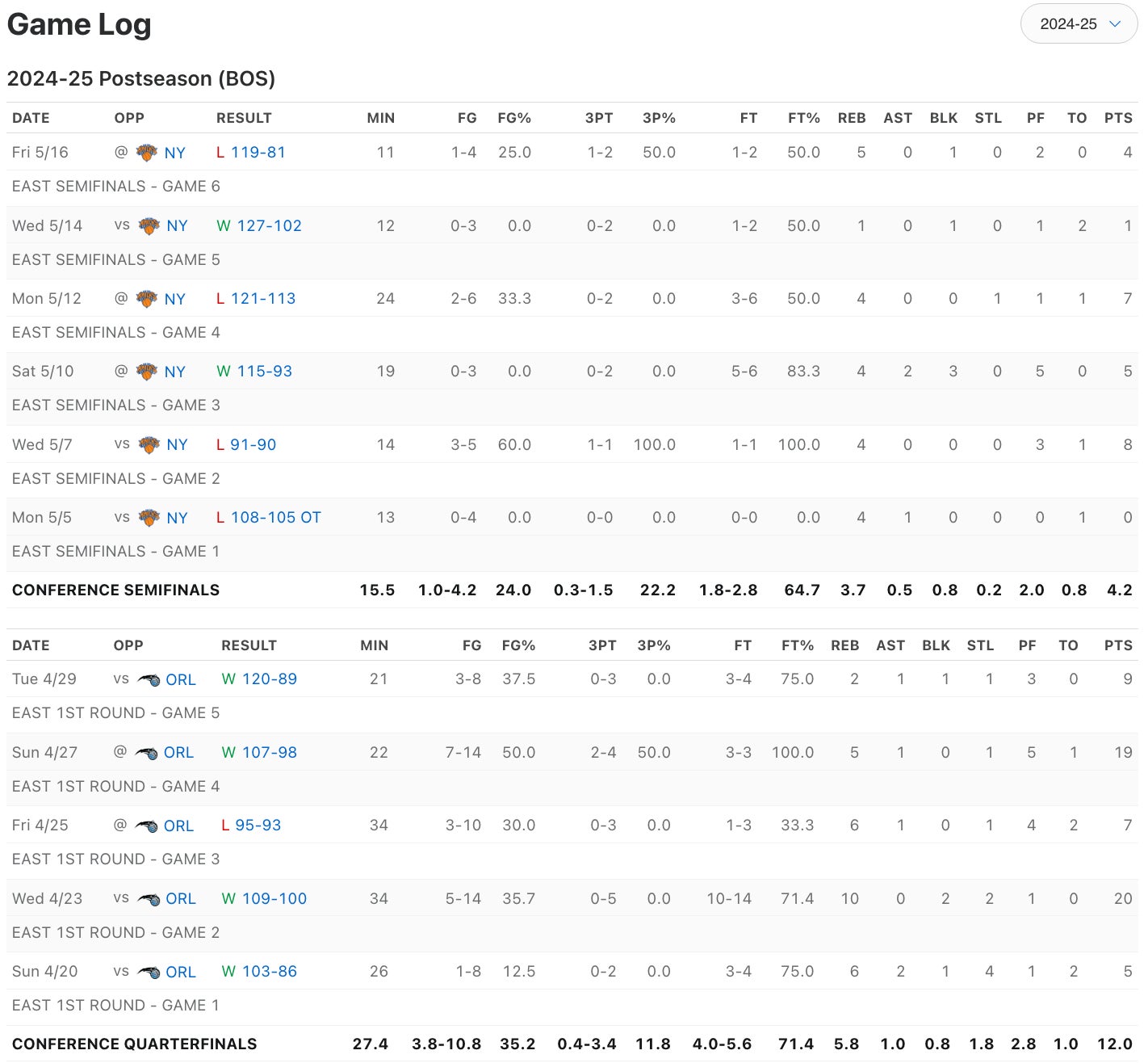 In the end, he's played 17 playoff games as a Celtic and averaged 8 points on 32/12% splits. He's had probably 1 good half as a Celtic in the playoffs, and that's not even factoring all this injury/availability issues. I'm sorry, but that's not good enough.