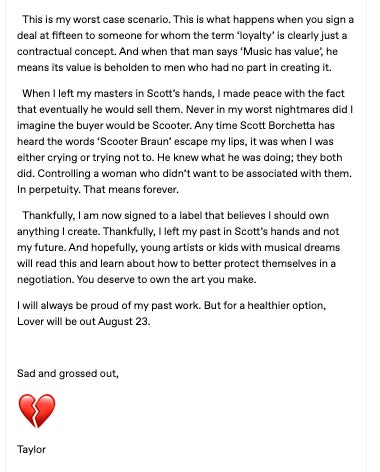 I’m extremely heartened by the conversations this saga has reignited within my industry among artists and fans. Every time a new artist tells me they negotiated to own their master recordings in their record contract because of this fight, I’m reminded of how important it was for all of this to happen. Thank you for being curious about something that used to be thought of as too industry-centric for broad discussion. You’ll never know how much it means to me that you cared. Every single bit of it counted and ended us up here.