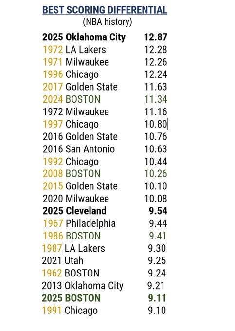They have had different styles and approaches, but the dominance is nearly identical. Even their team construction is pretty similar. SGA is their Tatum, JDub is their Jaylen Brown, Chet is their Porzingis, iHart is their Al Horford, Caruso is their Derrick White, Dort is their Jrue Holiday etc. OKC has shooters off the bench as well as lineup versatility. They can play small, they can play big, they can fit whatever style their opponent wants to play.